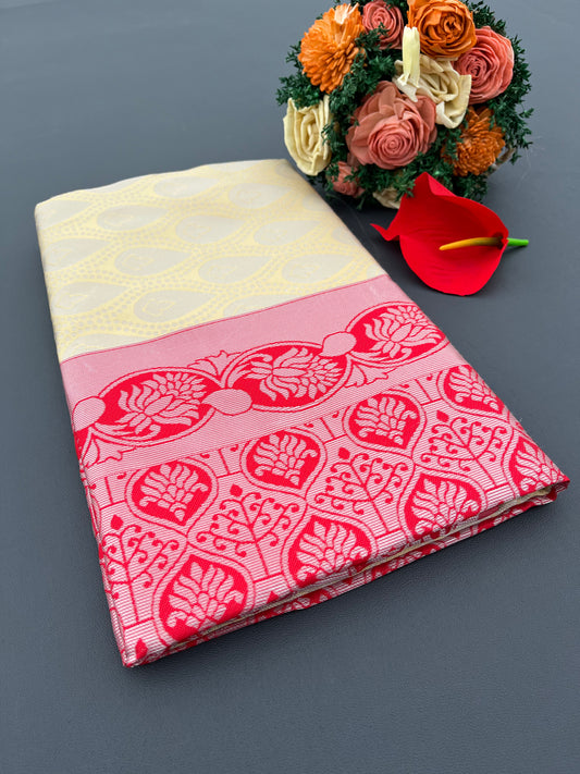 CHIKU & RED SOFT SILK BANARASI SAREE